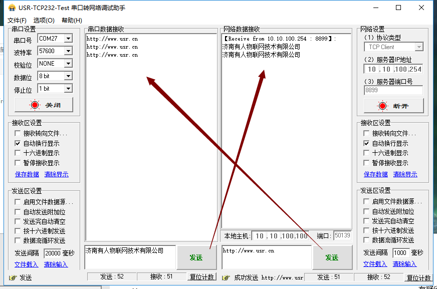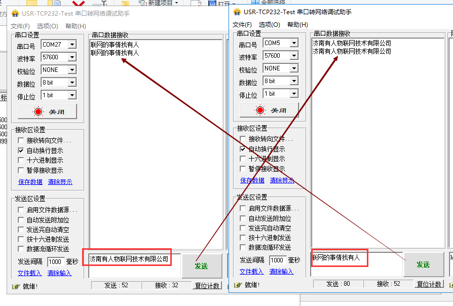從下圖可以看出,串口和網絡端可以正常的雙向數據收發