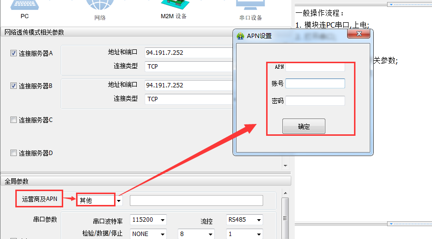 全局參數-->運營商及APN-->其他,在彈出的框里面設置APN信息,用戶名和密碼(有的話就設置,沒有的話,就空著)