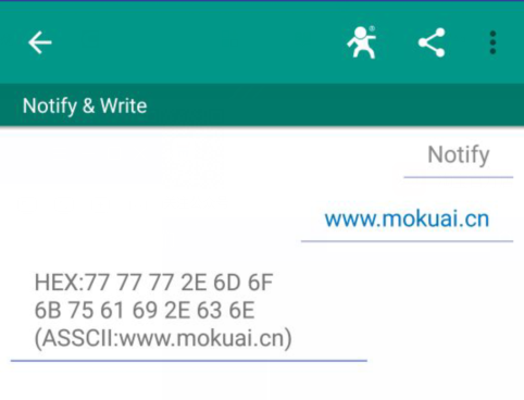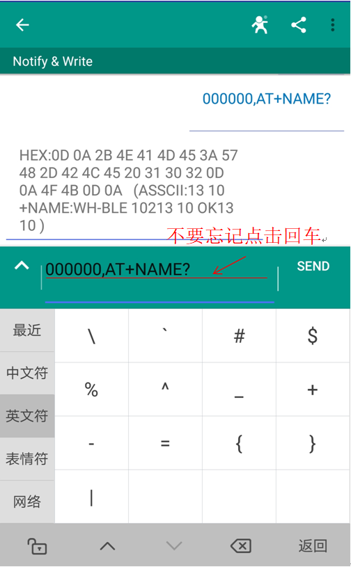 我們點(diǎn)擊第一個(gè)Service進(jìn)去,然后選擇最下面DEBUG選項(xiàng)點(diǎn)擊進(jìn)入,我們首先點(diǎn)擊下面的NOTIFY,點(diǎn)擊之后變?yōu)?/span>STOP NOTIFY,說(shuō)明進(jìn)入監(jiān)聽(tīng)狀態(tài),此時(shí)我們可以通過(guò)串口接收數(shù)據(jù),要想發(fā)送數(shù)據(jù),點(diǎn)擊左面的向上的符號(hào),里面有WRITE一項(xiàng),我們可以點(diǎn)開(kāi)后輸入發(fā)送的數(shù)據(jù),點(diǎn)擊SEND后,串口那邊將會(huì)收到你發(fā)送的數(shù)據(jù)。