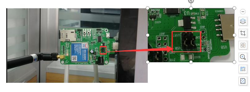 2. 安裝驅動完成后,將405tf測試底板上的跳線帽接到USB端,見下圖