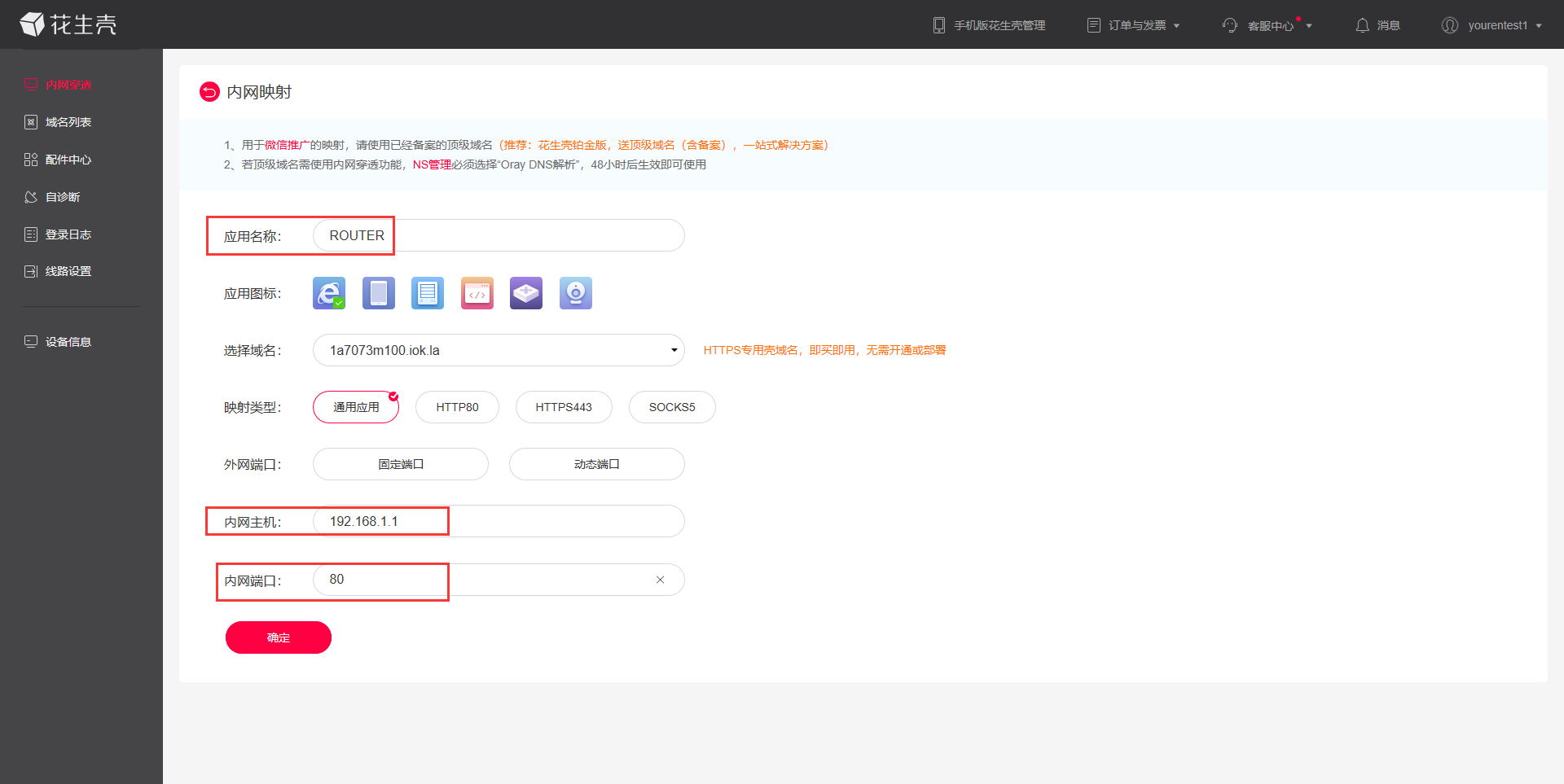 5、應用名稱可以自定義,以便于自己區(qū)分。應用圖標、應用域名、映射類型、外網端口可以根據(jù)自己需求來選擇,有些選項是收費的。(具體收費細則可咨詢花生殼的相關銷售和技術,本功能是第三方應用,我司不對其進行收費等業(yè)務辦理。)在這里如下設置。內網主機填寫路由器的LAN口IP地址,端口是80(路由器的內置網頁固定端口,不可修改).設置完成后點擊確定。
