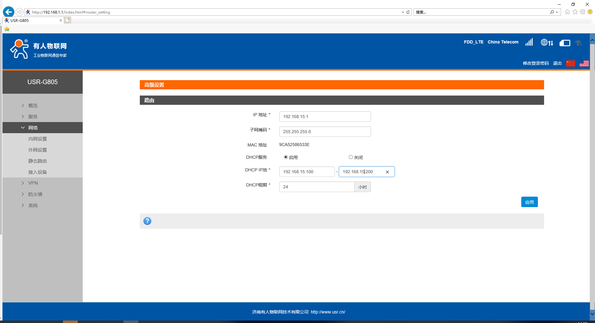 3、 進入配置網頁后,點擊網絡---內網設置界面,默認IP地址192.168.1.1,DHCP IP池是從192.168.1.100—192.168.1.200.