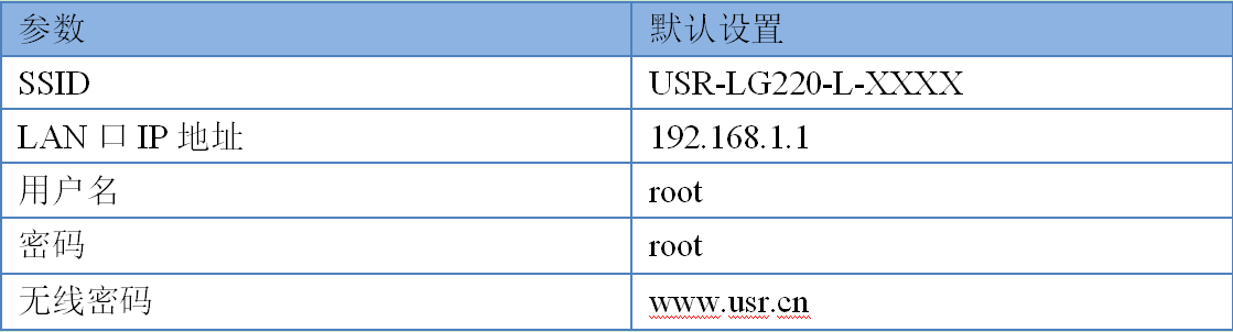 默認情況下,USR-LG220-L的無線AP的默認名稱為USR-LG220-L -xxxx,IP地址和用戶名、密碼如下: