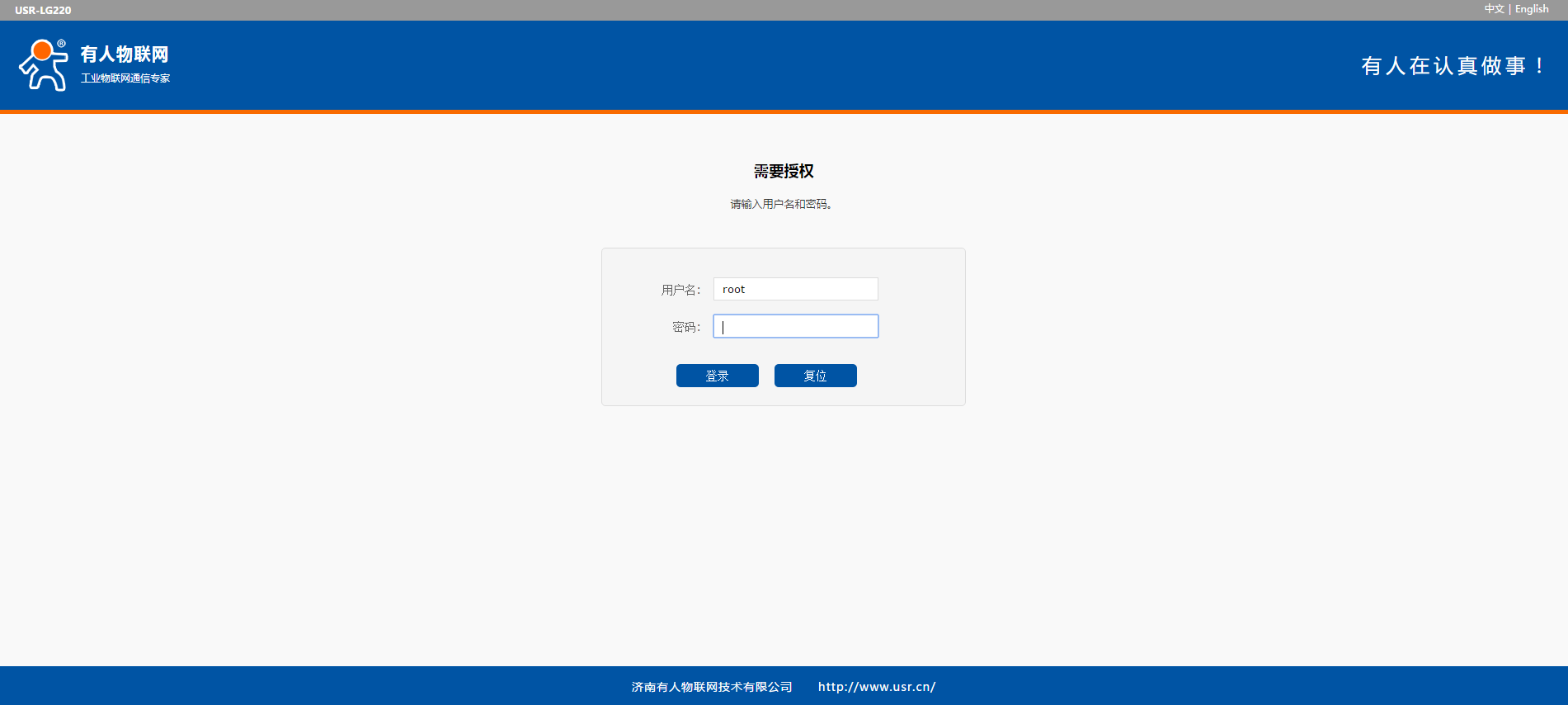等無線連接好后,打開瀏覽器,在地址欄輸入192.168.1.1回車。填入用戶名和密碼(均為root),然后點擊確認登錄,網頁會出現USR-LG220-L的管理頁面,如下圖。