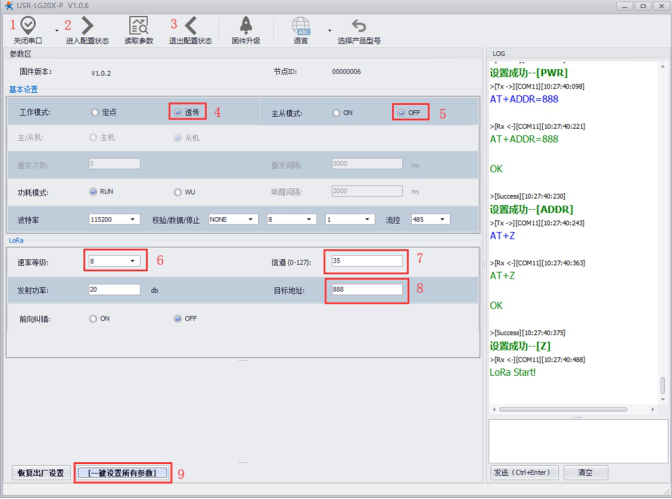 打開LoRa設(shè)置軟件(LG207和LG206-P選擇同一個(gè)),依次點(diǎn)擊打開串口(選擇A、B對(duì)應(yīng)的串口號(hào),串口參數(shù):115200,None,8,1,NFC)、進(jìn)入配置狀態(tài)、讀取參數(shù)、配置上表中的參數(shù)、一鍵設(shè)置所有參數(shù),關(guān)閉LoRa設(shè)置軟件。