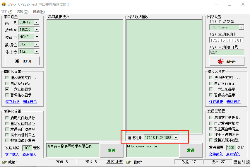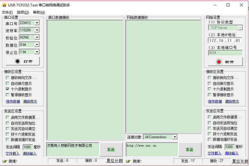打開USR-TCP232-Test串口轉網絡調試助,下載地址http://m.0575400.com/Download/27.html