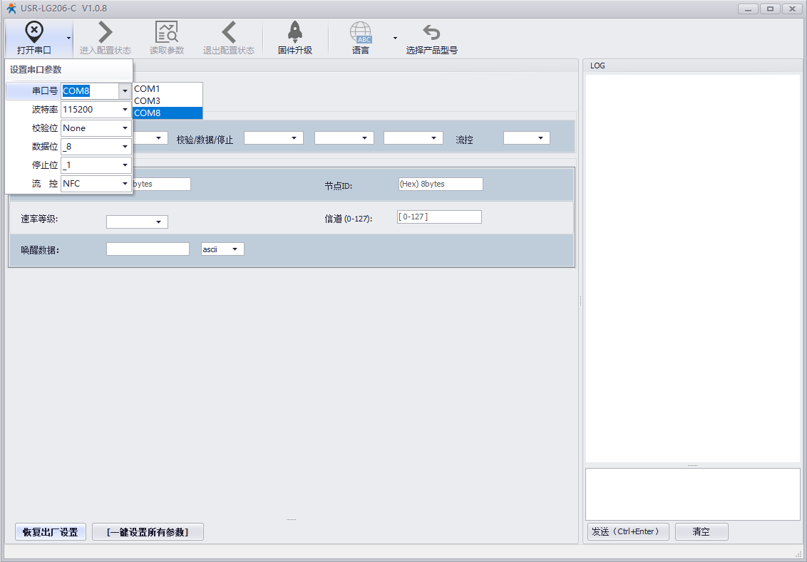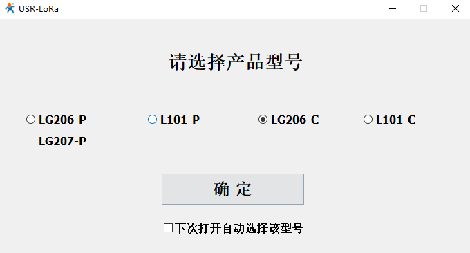 這里以有人LoRa終端USR-LG206-L-C為例。使用串口線連接LoRa終端的RS232接口與電腦,打開USR_LoRa軟件(http://m.0575400.com/Down/USR_LoRa_SET-V1.0.8.rar),選擇LG206-C。