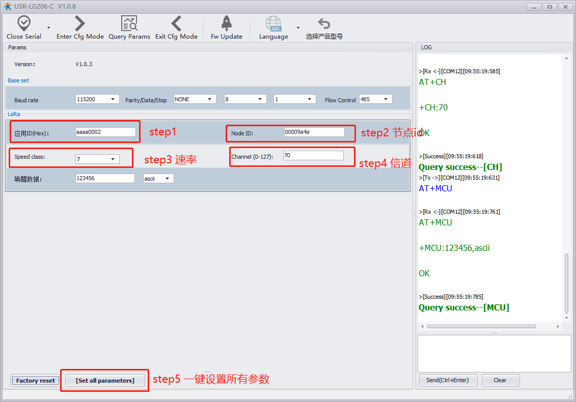 設置應用ID、信道、速率。在下圖所示區域設置應用ID為aaaa0002、速率等級設為7、信道設為70,然后點擊“一鍵設置所有參數”。應用ID要與集中器設置的應用ID一致,信道要與集中器通道1設置的信道一致,速率要與集中器通道1設置的速率一致,在同一個集中器的LoRA網絡內節點的應用ID要保證唯一。節點ID為206標簽上表示的ID. 設置完成關閉串口。