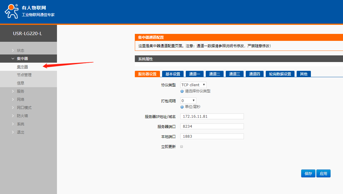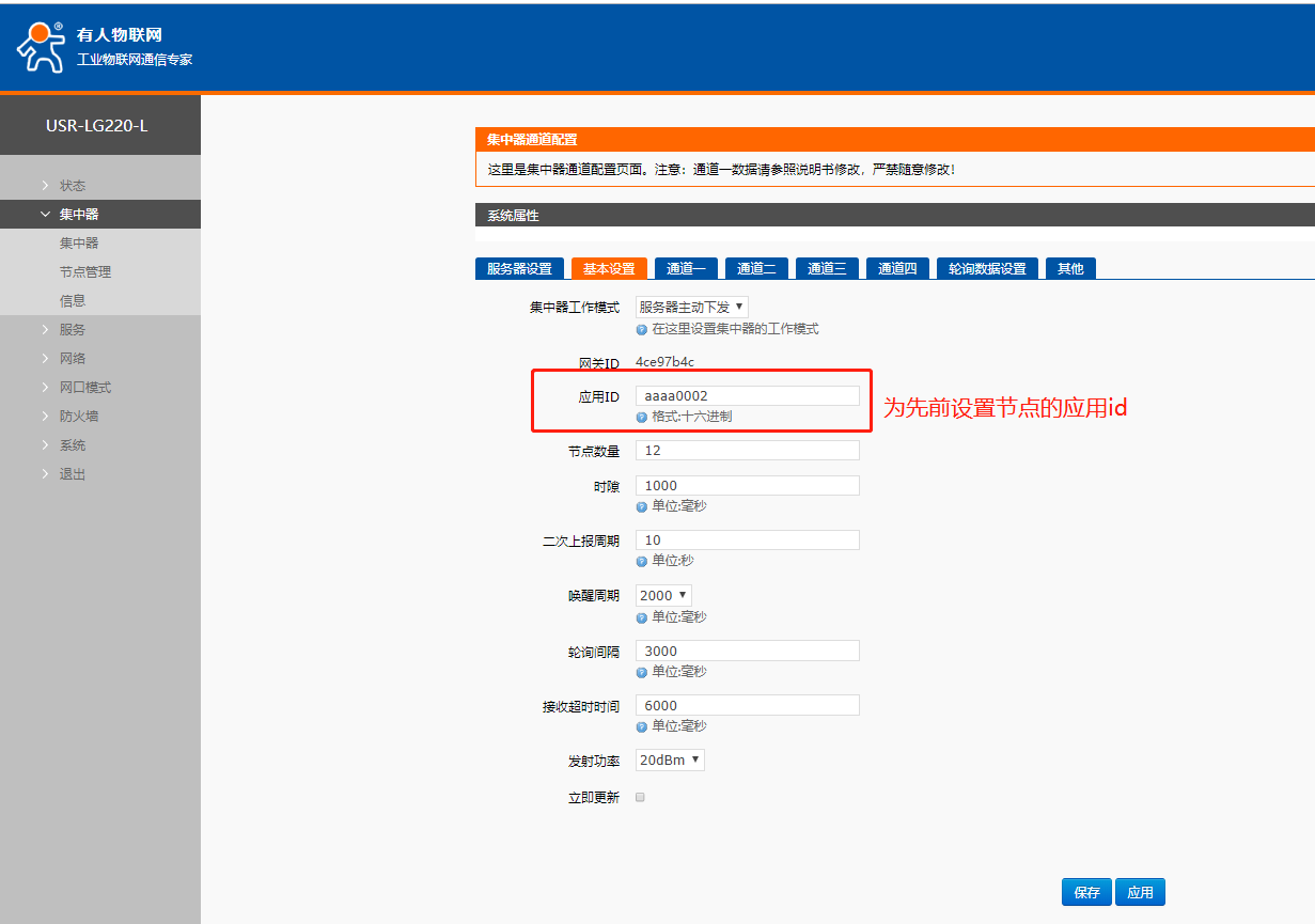 (4)設置集中器的應用ID,依次點擊集中器,基本設置,應用ID,設置應用ID和lora相同。最后保存應用。