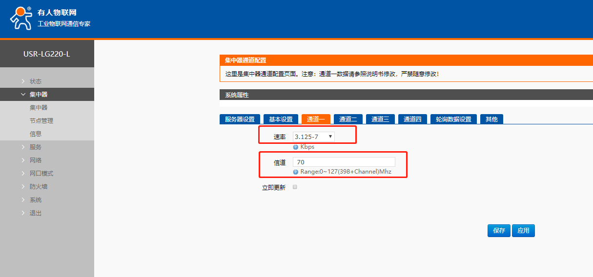 (5)設置集中器的信道和速率,依次點擊集中器,通道一設置速率和信道和lora相同,點擊保存應用,通道二、三、四中設置的速率與信道各不相同,且都與通道一不同。
