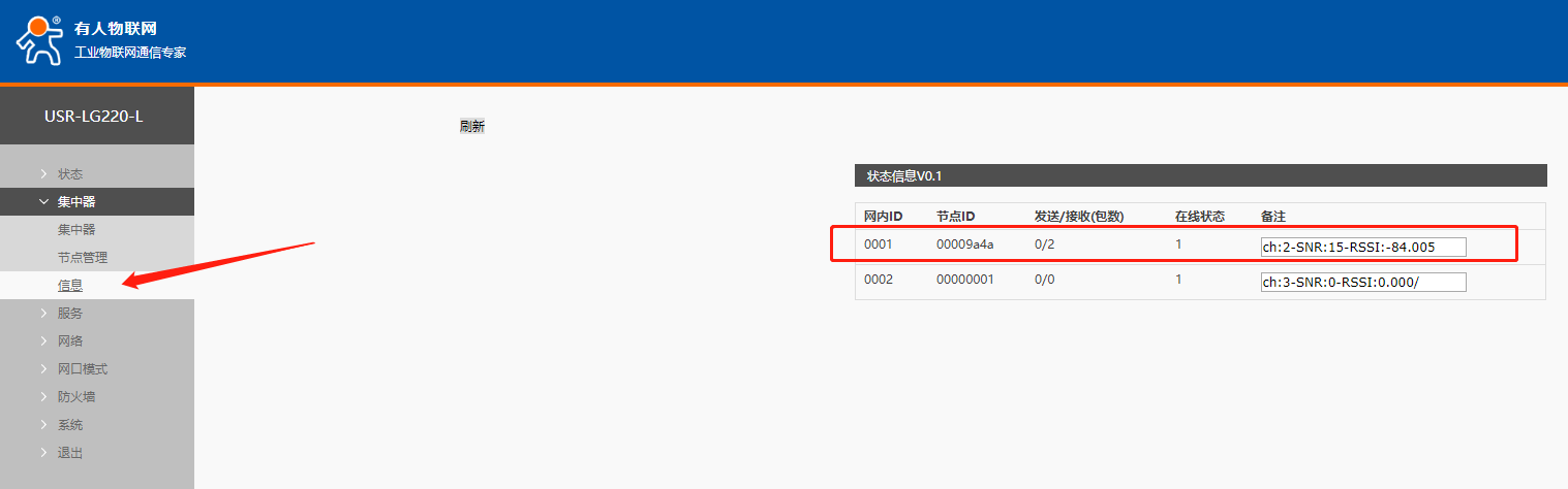 (6)點擊系統—重啟,執行重啟。重啟完畢登陸集中器在集中器—信息 可參看加入的節點信息,串口助手會顯示連接對象ip與端口號。