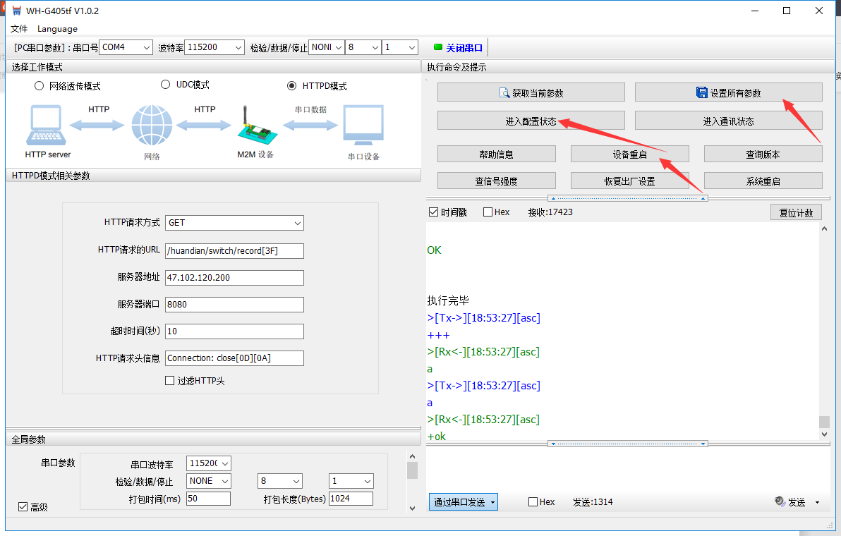 3. 是否在已經(jīng)進(jìn)入AT指令配置模式下重復(fù)點(diǎn)擊進(jìn)入配置狀態(tài)按鈕或者發(fā)送進(jìn)入配置模式的命令,點(diǎn)擊進(jìn)入通信狀態(tài)(多次間隔2秒嘗試),若能但會(huì)ok,則證明之前在AT指令配置狀態(tài)。