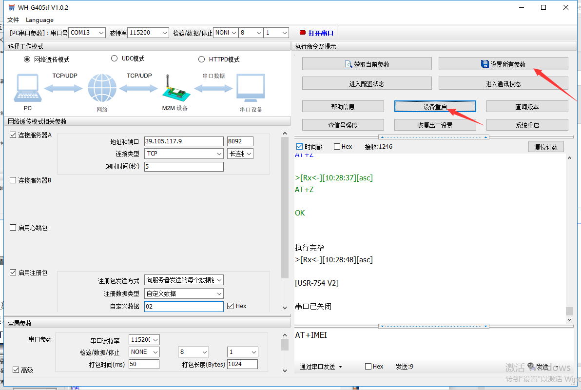 3. 配置好兩個DTU之后點擊設置所有參數(shù),然后重啟設備使參數(shù)配置生效,如圖3