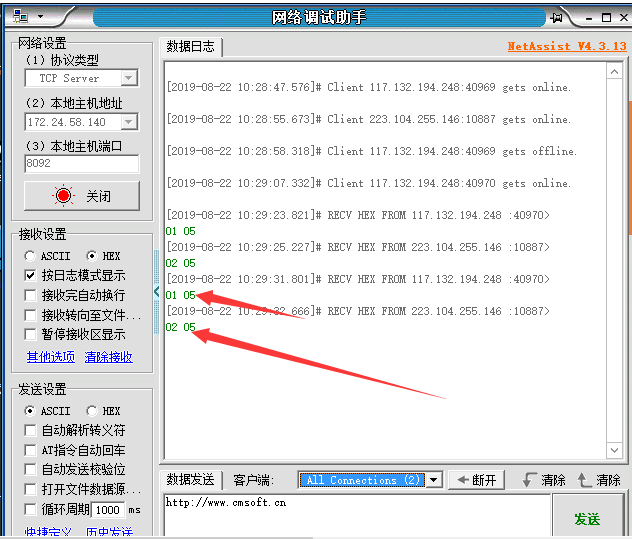 4. 連接服務器連接后,使用串口調(diào)試助手分別連接兩個DTU,向服務器發(fā)送數(shù)據(jù)(此服務器為遠程桌面臨時測試服務器,用戶在實際應用中應連接自己的服務器進行使用)。