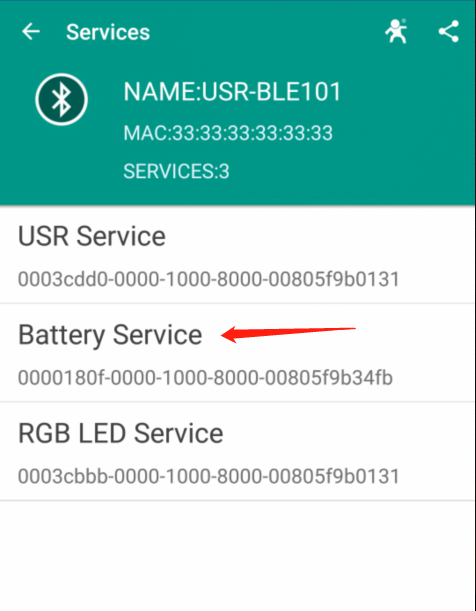 點擊該設備可以與設備建立連接,此時LINK燈變為常亮,軟件界面如圖所示, 選擇Battery Service點擊Read(app查詢電量需保證已配置AT+BATEN=ON)。