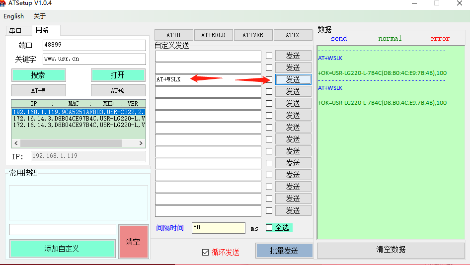 5) 也可在此界面發送AT指令進行查詢或配置,發指令無返回時,需要重新點擊“搜索”。