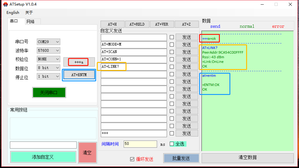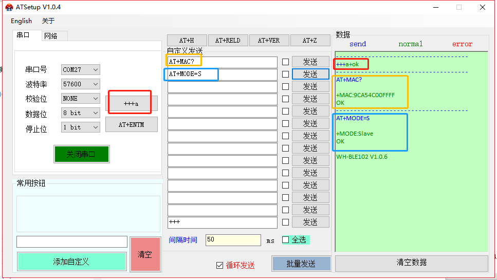 正確打開串口后,點擊“+++a”,接收區(qū)顯示“a+ok”說明模塊進入了命令行模式。