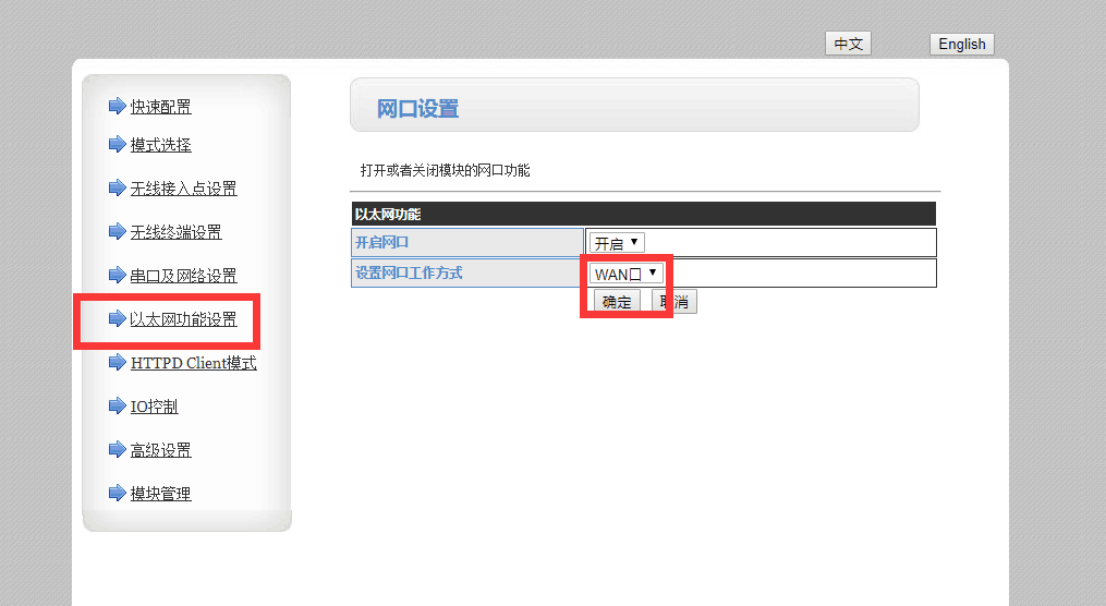 1、將模塊的網口設置成WAN口去連路由器
