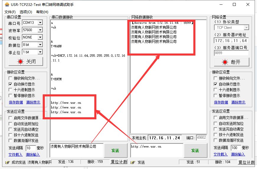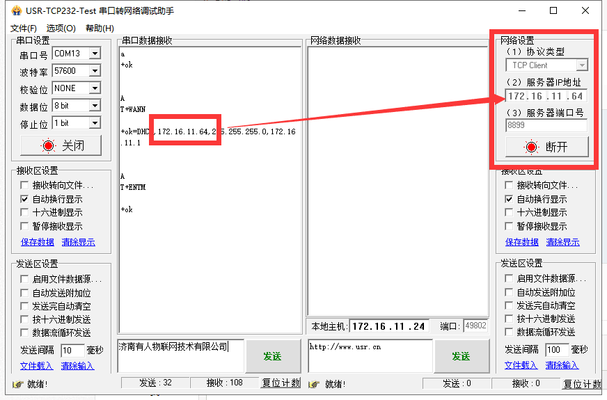 3、打開串口,用AT指令查詢模塊的WAN口IP,填寫到PC2的服務器地址處,端口號寫上面設置的端口號。