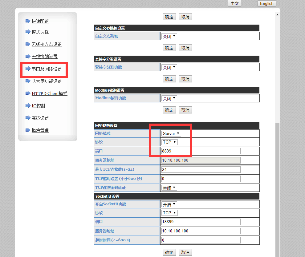 · 網絡參數默認值:TCP,Sever,8899,10.10.100.254