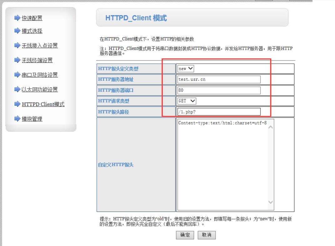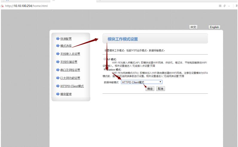 2、在模式選擇設置為STA模式,數據傳輸格式為Httpd client ,設置完點擊確定;