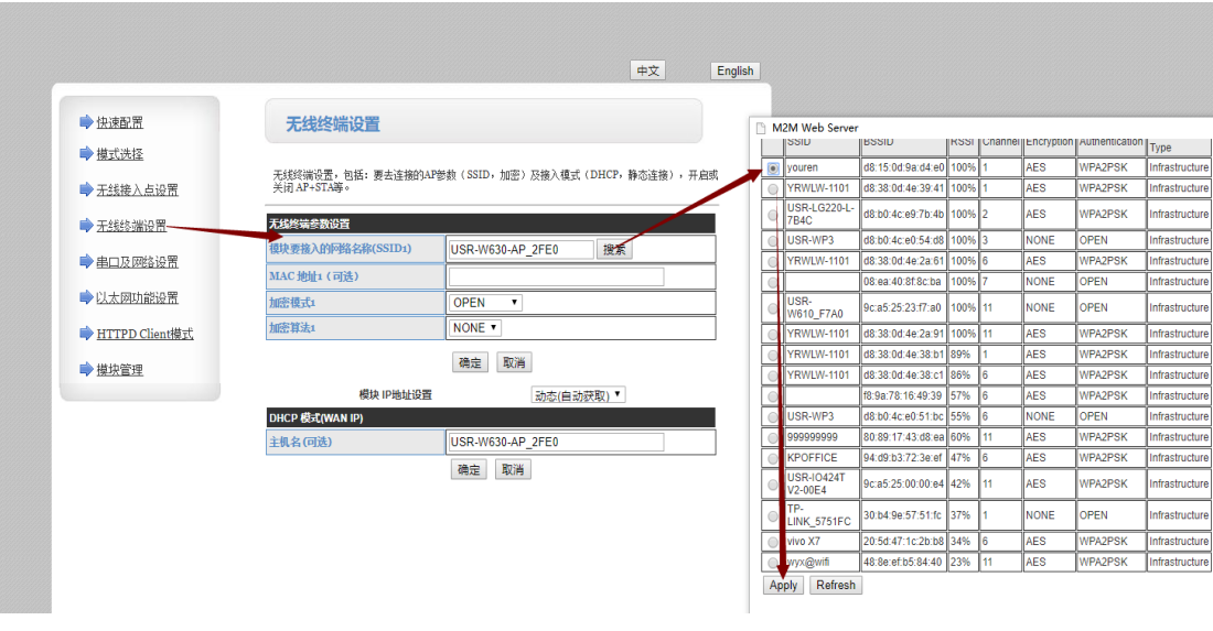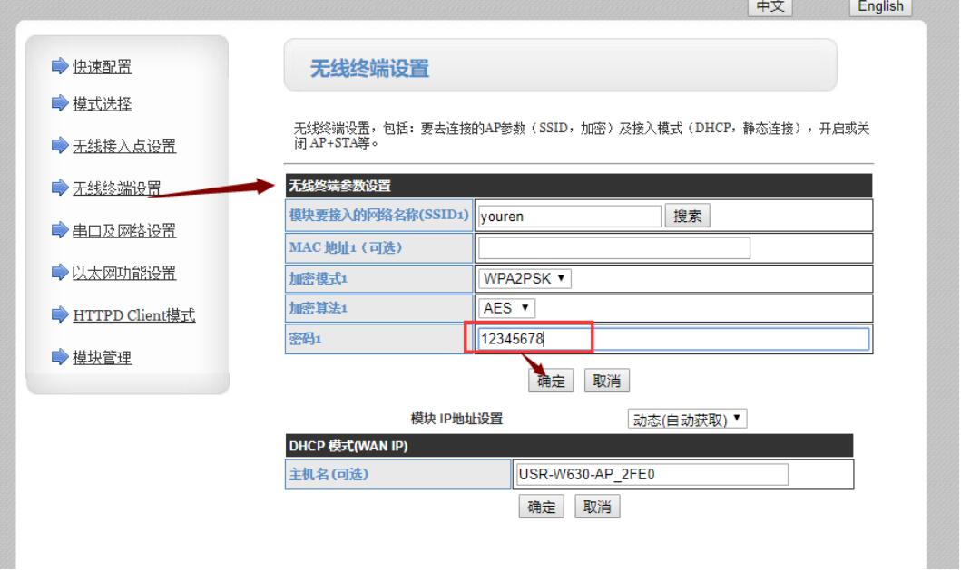 3、搜索WiFi模塊要連接的路由器ssid,設置上密碼,點擊確定;