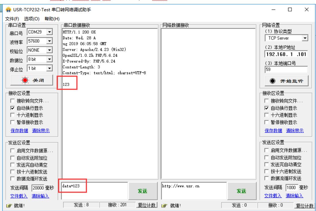 8、打開一個串口調試助手,選擇上與硬件設備一致的串口參數,發送data=123.測試服務器會返回123;