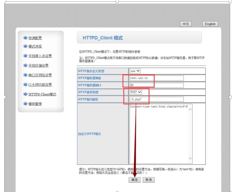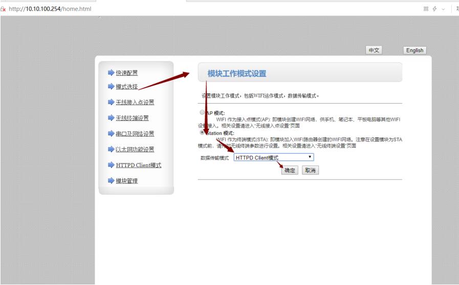 2、在模式選擇設置為STA模式,數據傳輸格式為Httpd client ,設置完點擊確定;