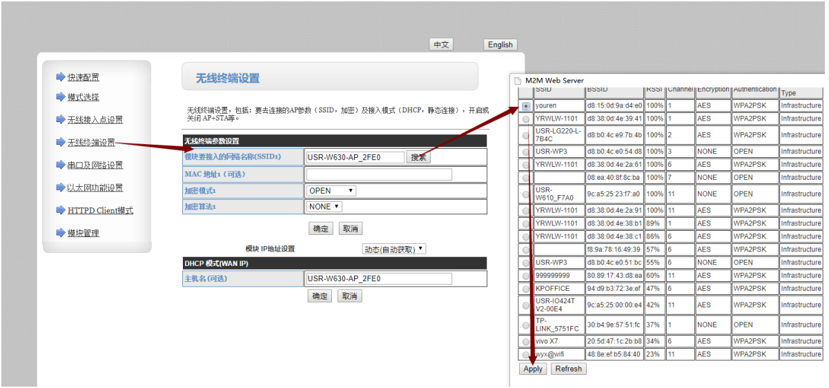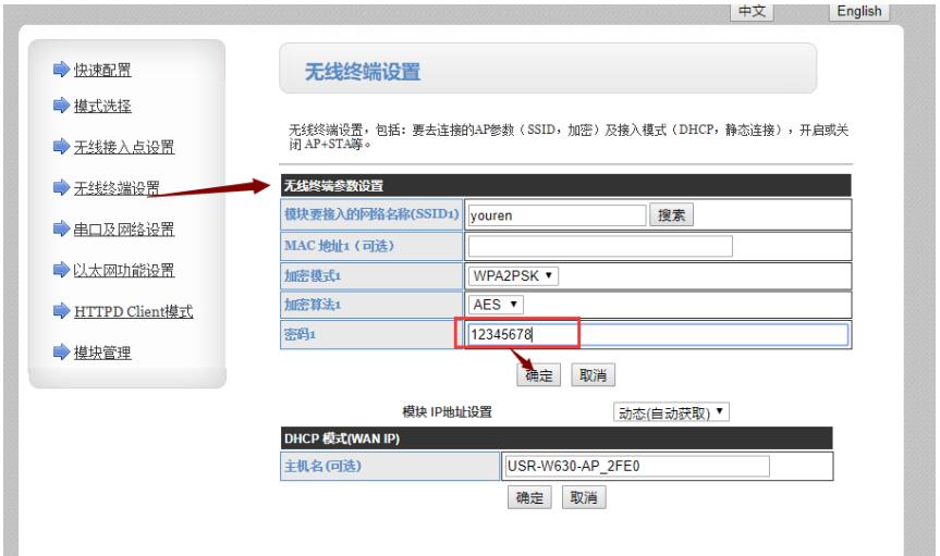 3、搜索WiFi模塊要連接的路由器ssid,設置上密碼,點擊確定;