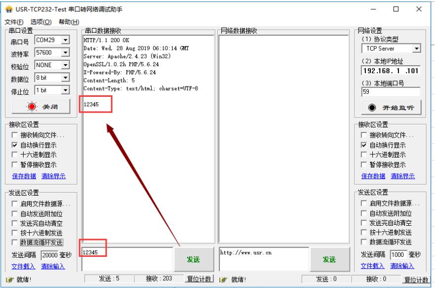 8、打開一個串口調試助手,選擇上與硬件設備一致的串口參數,發送12345,測試服務器會返回12345;