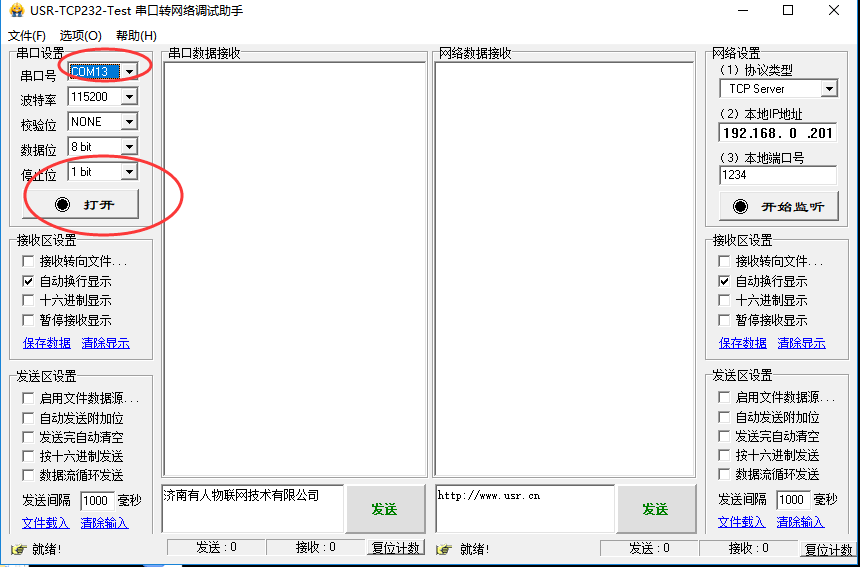 3. 打開(kāi)測(cè)試軟件:USR-TCP232-Test-V1.3,選擇相應(yīng)com口(我得電腦右擊->屬性->設(shè)備管理器,com口中可以看到),然后將串口得設(shè)置和設(shè)備得串口參數(shù)一一對(duì)應(yīng),對(duì)應(yīng)好打開(kāi)com口。如圖所示: