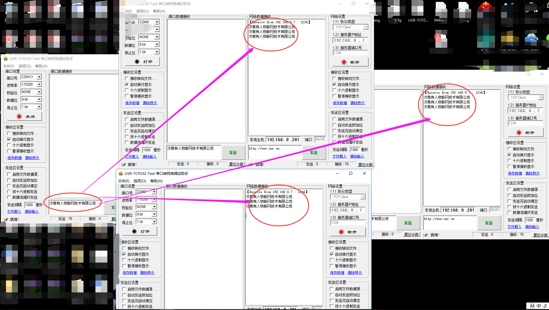 5. 從COM口發(fā)送數(shù)據(jù),三個(gè)測(cè)試軟件(可以理解為3臺(tái)電腦都可以收到數(shù)據(jù))