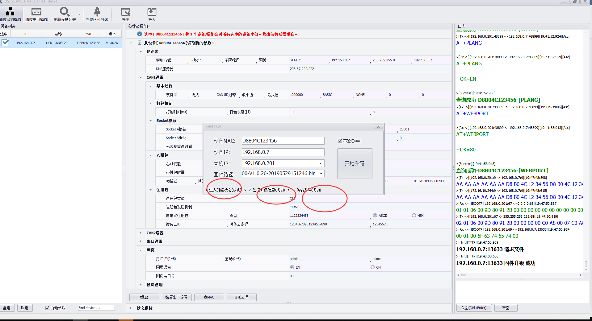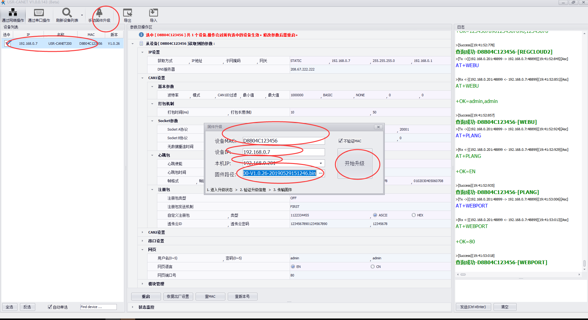 USR-CANET200、標準電源適配器、所要升級的固件(可提工單獲取最新固件)、USR-CANET V1.0.0.143 (Beta)(設置軟件,用來固件升級的工具)。