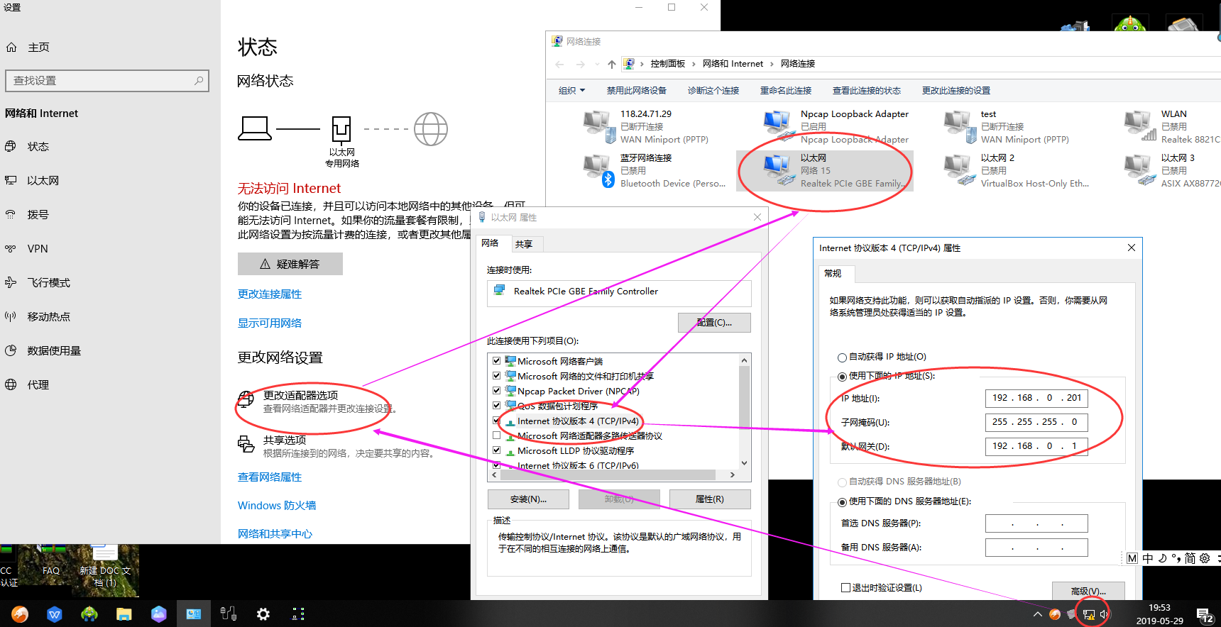 (右擊網(wǎng)絡圖標,打開網(wǎng)絡和Internet設置,更改適配器,然后選擇相應的網(wǎng)卡,修改相應的IP地址)