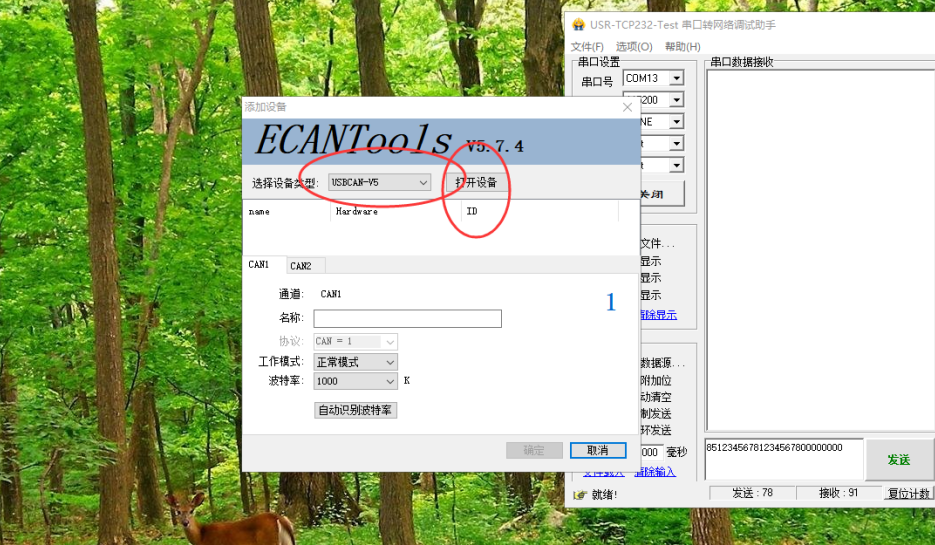 選擇設備類型為“USBCAN-V5”然后打開設備