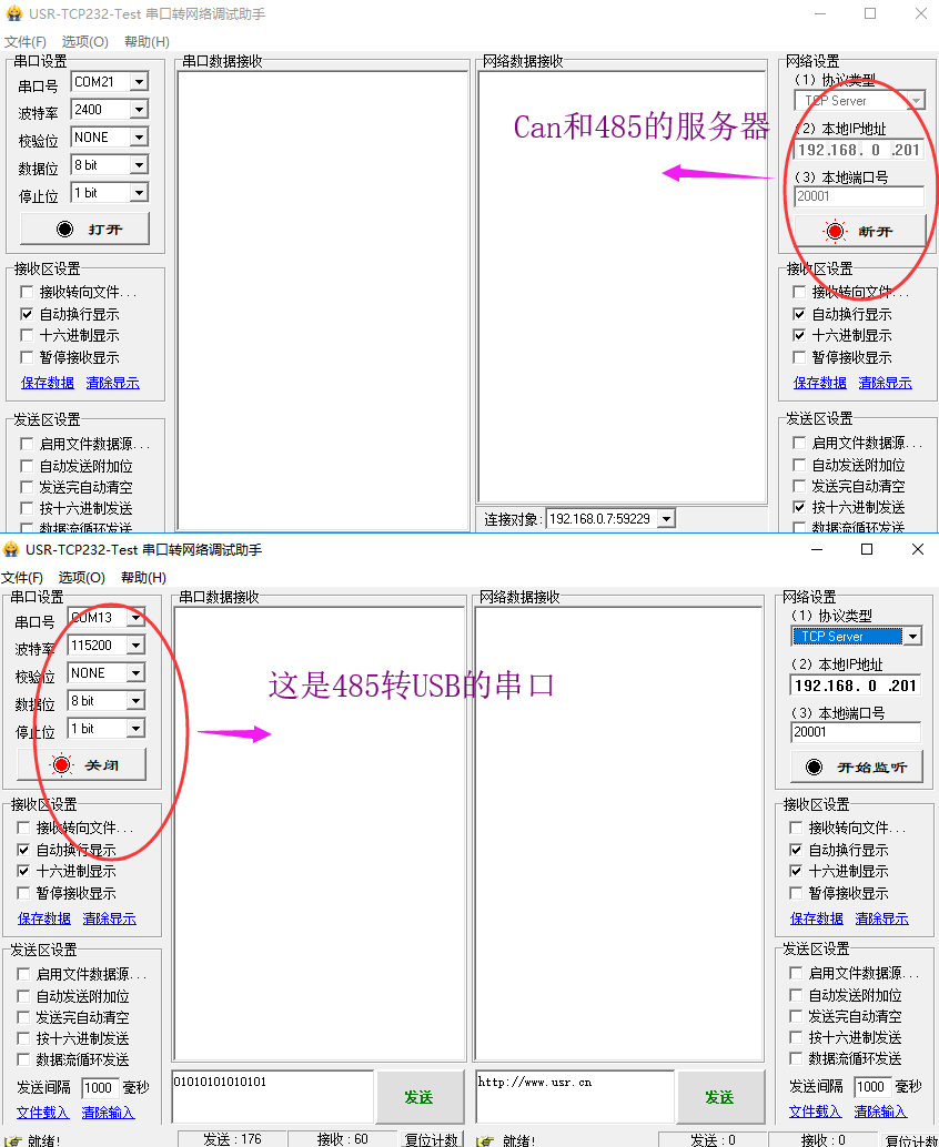 5. 然后打開兩個測試軟件:USR-TCP232-Test-V1.3(一個是作為485串口接收端,一個作為Can和485的服務器),參數(shù)如圖所示: