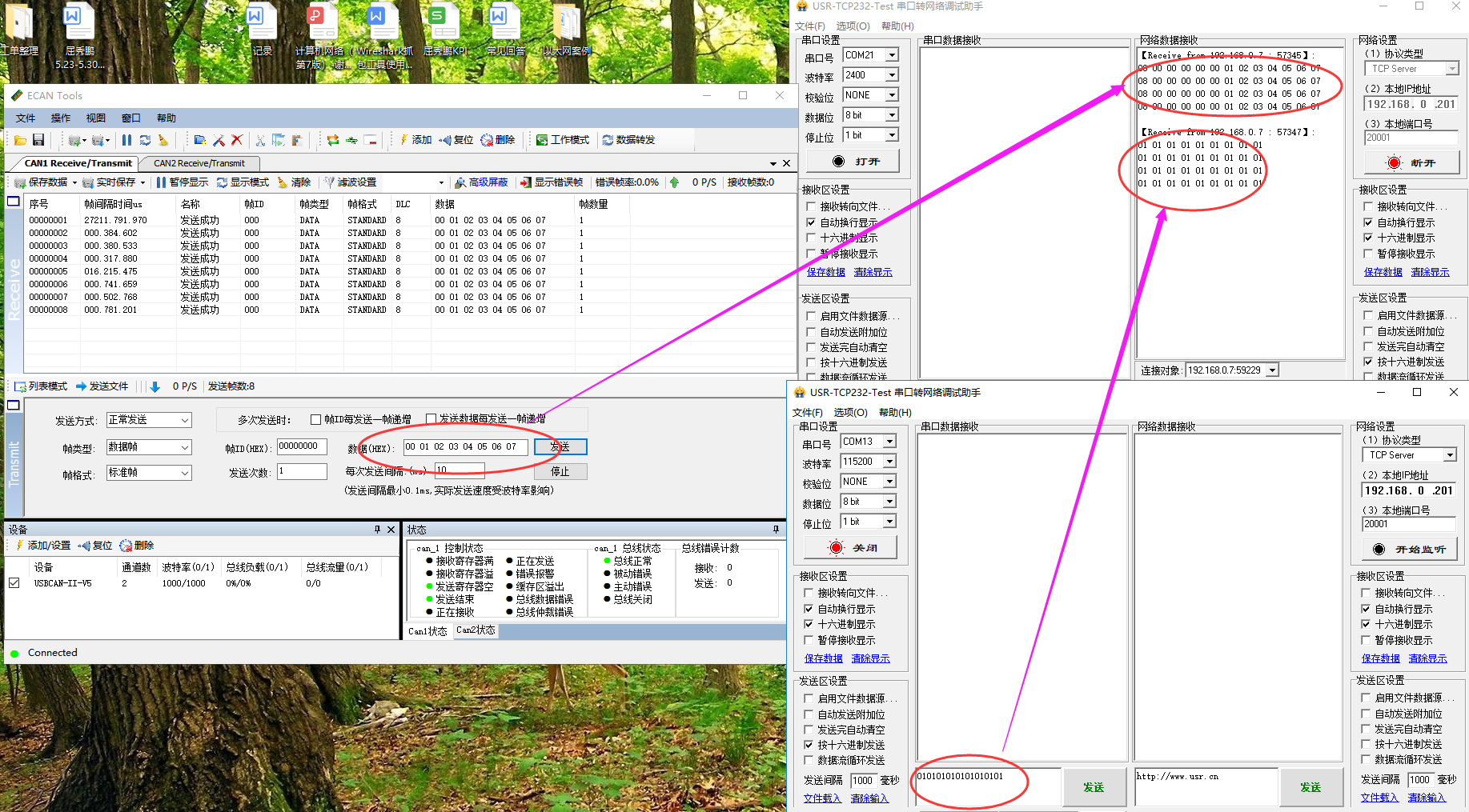 將設備USR-CANET200通過標準的適配器電源將設備上電,網(wǎng)線直連電腦。通過485轉USB串口線將塞設備的485串口和電腦相連接,然后通過Can轉USB串口線,將設備同電腦進行鏈接。