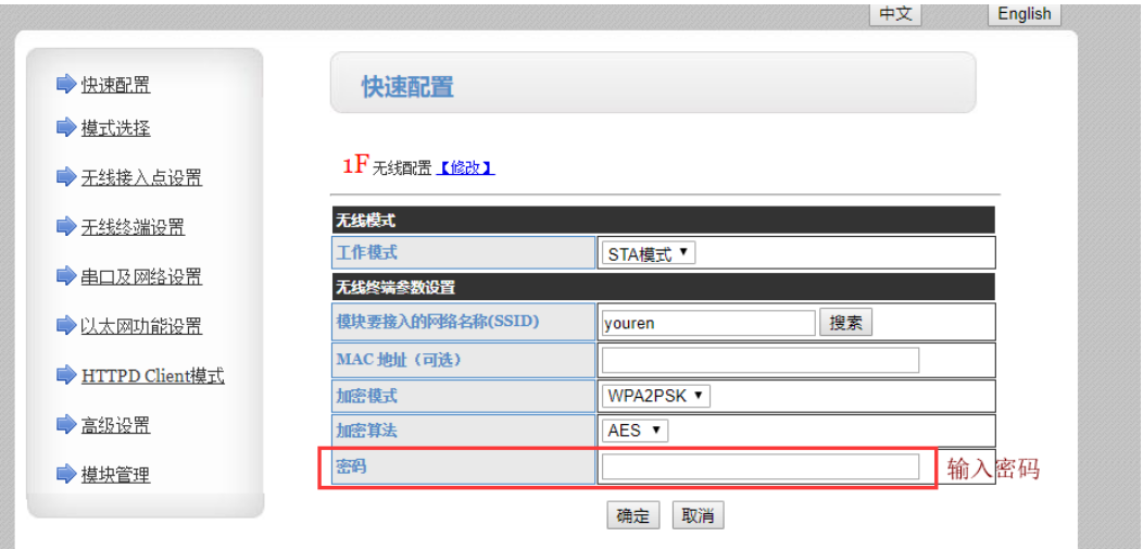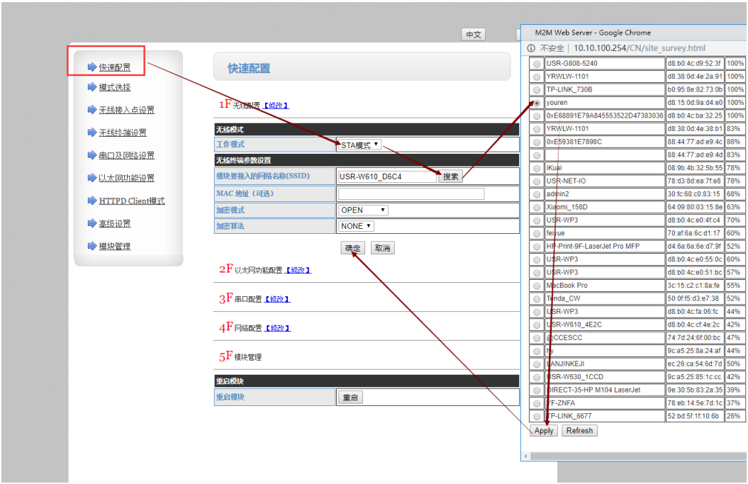 (1)點擊快速配置,選擇STA工作模式,點擊搜索,搜索路由器,選擇要連接的路由器