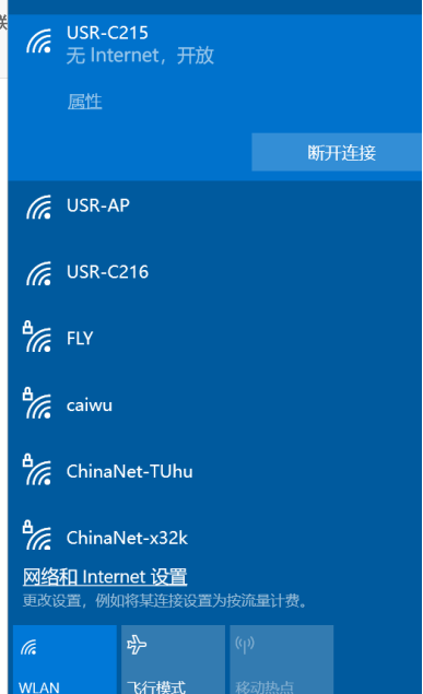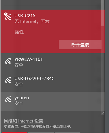 (1) 將模塊安裝到測試底板上,測試板串口連接電腦串口,電腦連接WiFi。在電腦無線搜索欄,搜索USR-C215,連接。