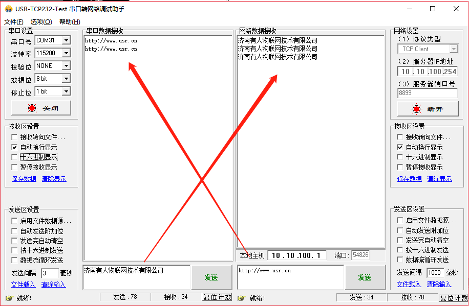 將模塊串口連接到電腦的串口,電腦的串口號為com31,WiFi模塊的IP為10.10.100.254,控制端口為8899.由于WiFi模塊默認為TCP server,所以電腦端連接模塊需要設置為TCP client連接模塊的server。