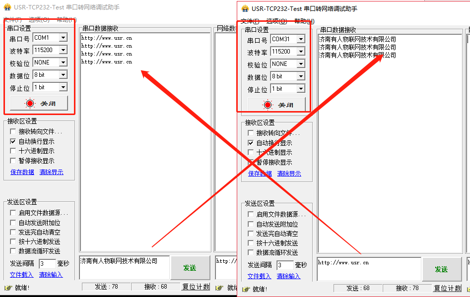 打開兩個串口調試助手軟件,一個連接電腦串口com5,一個連接虛擬串口com1.實現兩個串口直接數據互發。