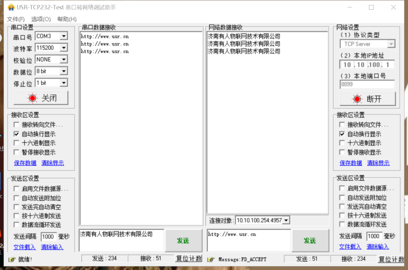 打開串口網絡調試助手軟件,可在軟件左上角的位置options切換中文,根據模塊內網頁設置的串口參數打開com3,網絡端選擇工作模式為TCP sever,填寫電腦的ip:10.10.100.1以及端口號8899。點擊開始監聽,可看到網絡端的連接對象。并可實現雙向數據傳輸。
