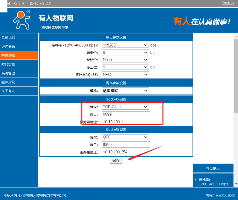 3、在透傳參數配置頁面,設置模塊工作模式為TCP client,讓電腦網絡調試助手模擬服務器。并設置端口號為8899(可自定義)點擊保存并重啟模塊。
