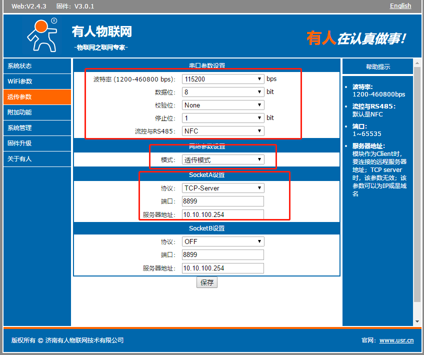 c. 查看透傳參數, 此處串口參數可以修改, Socket連接參數都可以修改,本案例使用默認參數,不做修改, 模塊做TCP Server端。 參數修改需要點擊保存,保存后會提示重啟, 可以把其他的參數設置完成一起重啟。