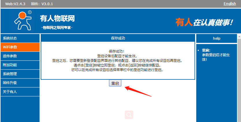 點擊重啟按鈕,模塊設置生效,等待模塊重啟完成,如果設置正確,模塊就會去連接路由器wifi。