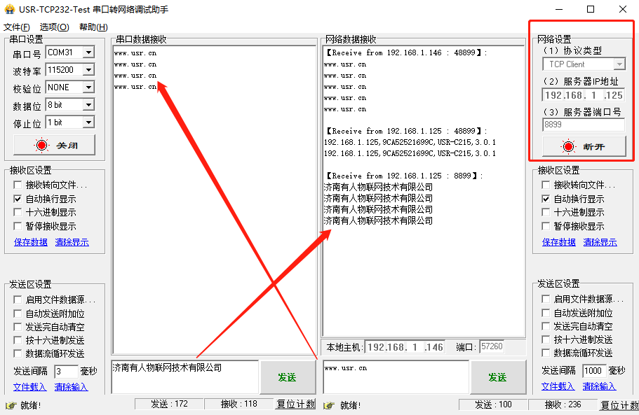 模塊的串口連接到電腦串口com31.然后網絡端口以TCP client的形式連接獲取到的IP:192.168.1.125.端口為8899. 實現串口數據發送到網絡端口,網絡數據發送到串口端口。