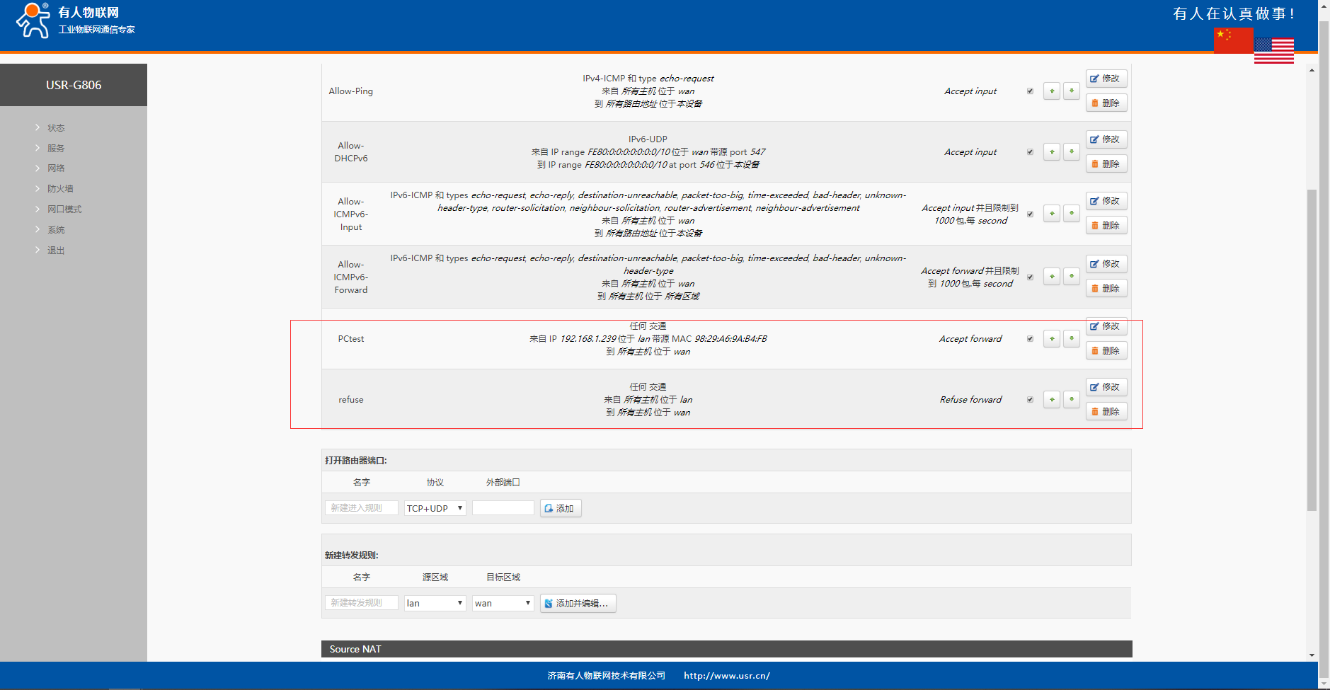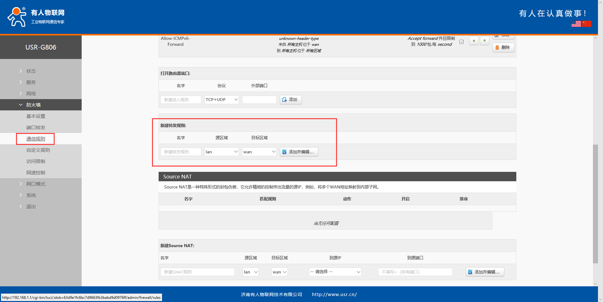 4、進入防火墻----通信規則界面,新建轉發規則,自定義轉發名稱,選擇源區域和目的區域后點擊添加并編輯。