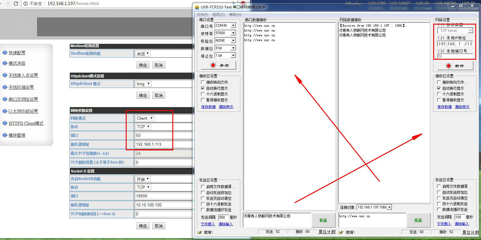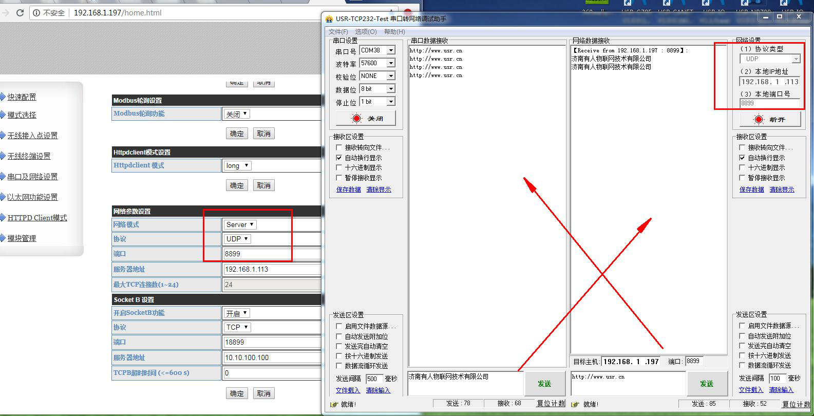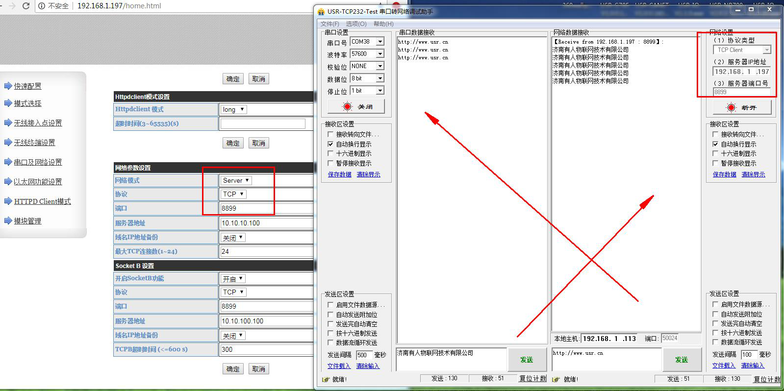 用USR-W610的IP 登錄USR-W610的網(wǎng)頁(yè),然后修改W610的串口參數(shù)。測(cè)試4種工作模式下,串口和網(wǎng)絡(luò)的數(shù)據(jù)透?jìng)鳌?/span>