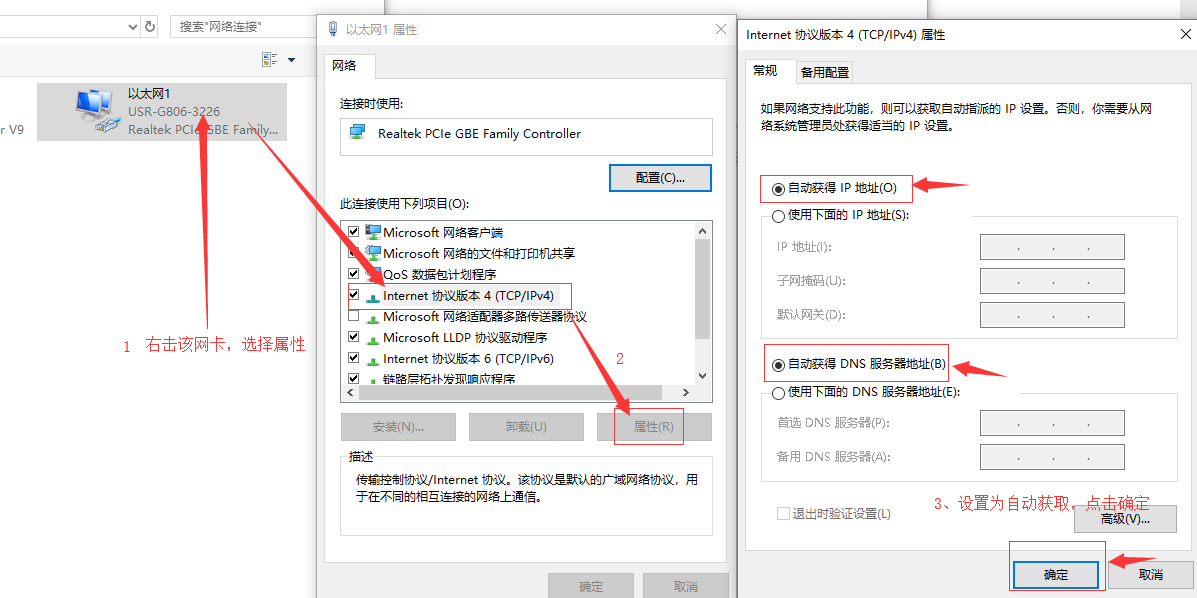 1)電腦配置網卡,選擇自動獲取IP地址