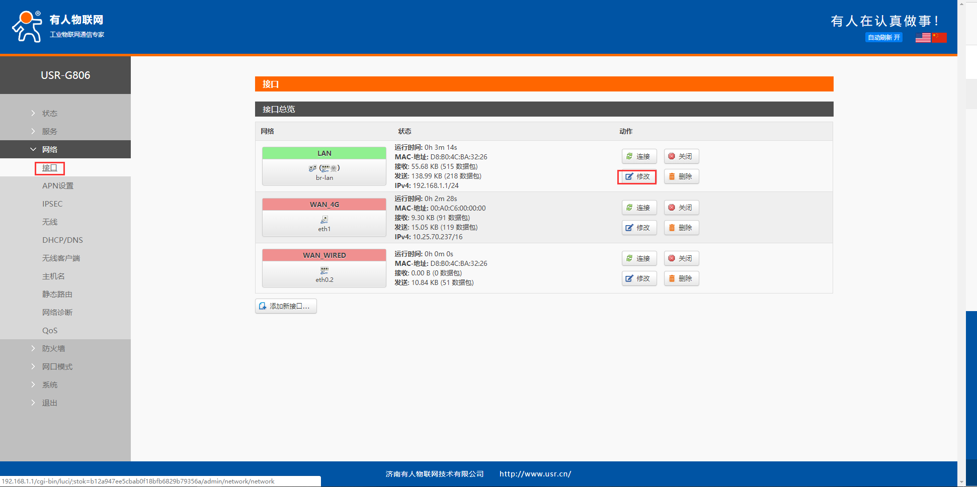 1、進入網絡---接口界面,點擊LAN口對應的修改按鈕,進入修改界面